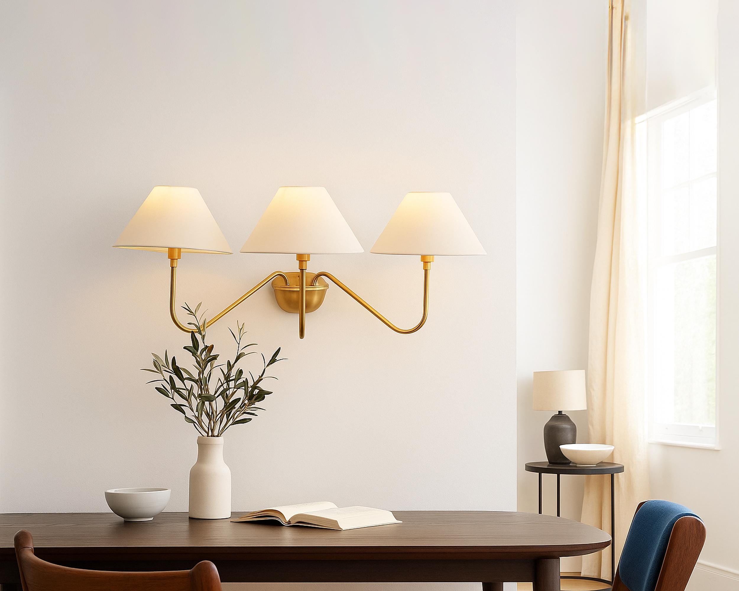 Triévo Gold Brass Triple-Arm Wall Sconce with Tapered Fabric Shades