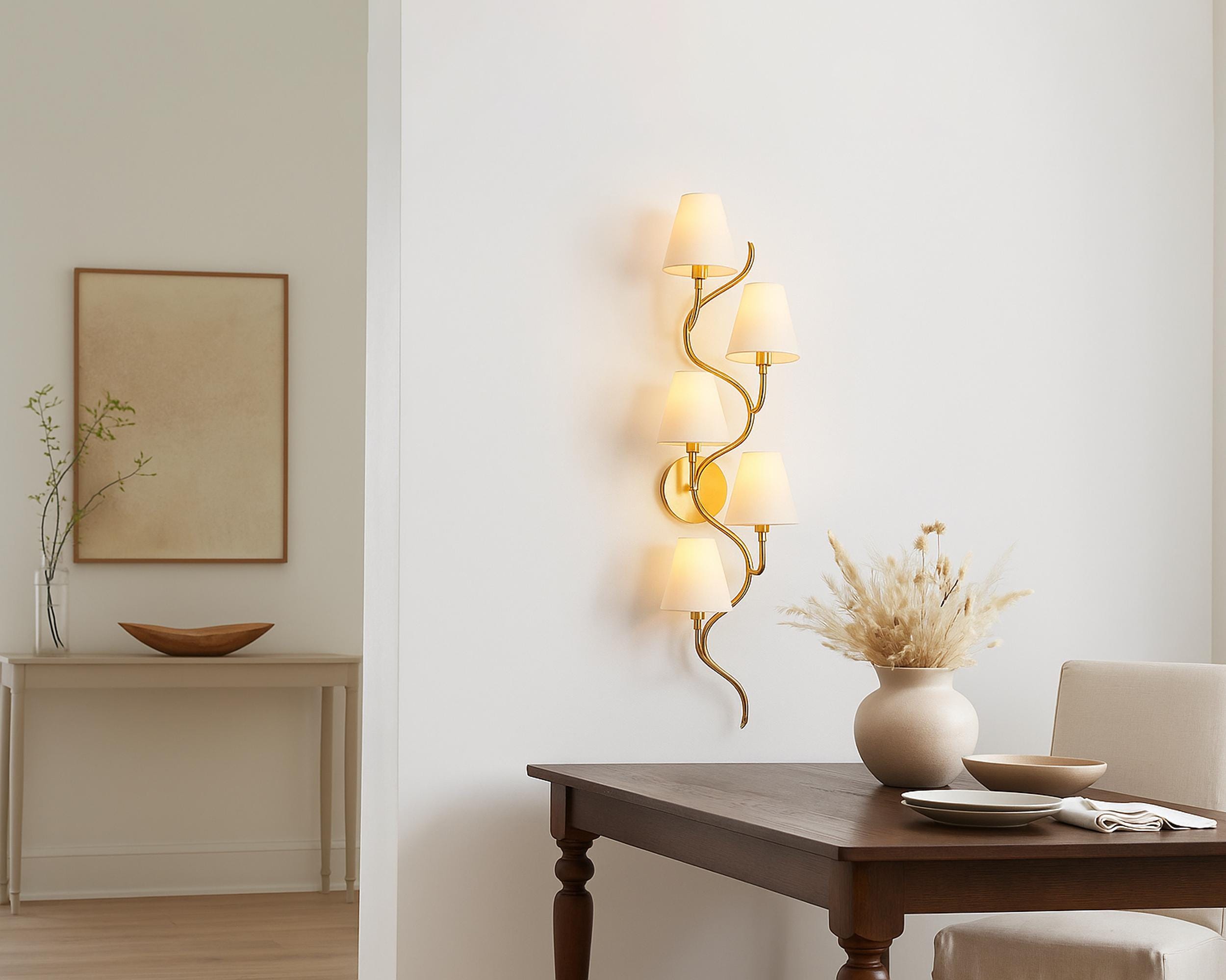 Luxury Sculpted Ribbon Wall Sconce, 5-Light Gold Finish with Fabric Shades | 38" Vertical Statement Wall Lamp, E14 Base, Hardwired (110–240V)