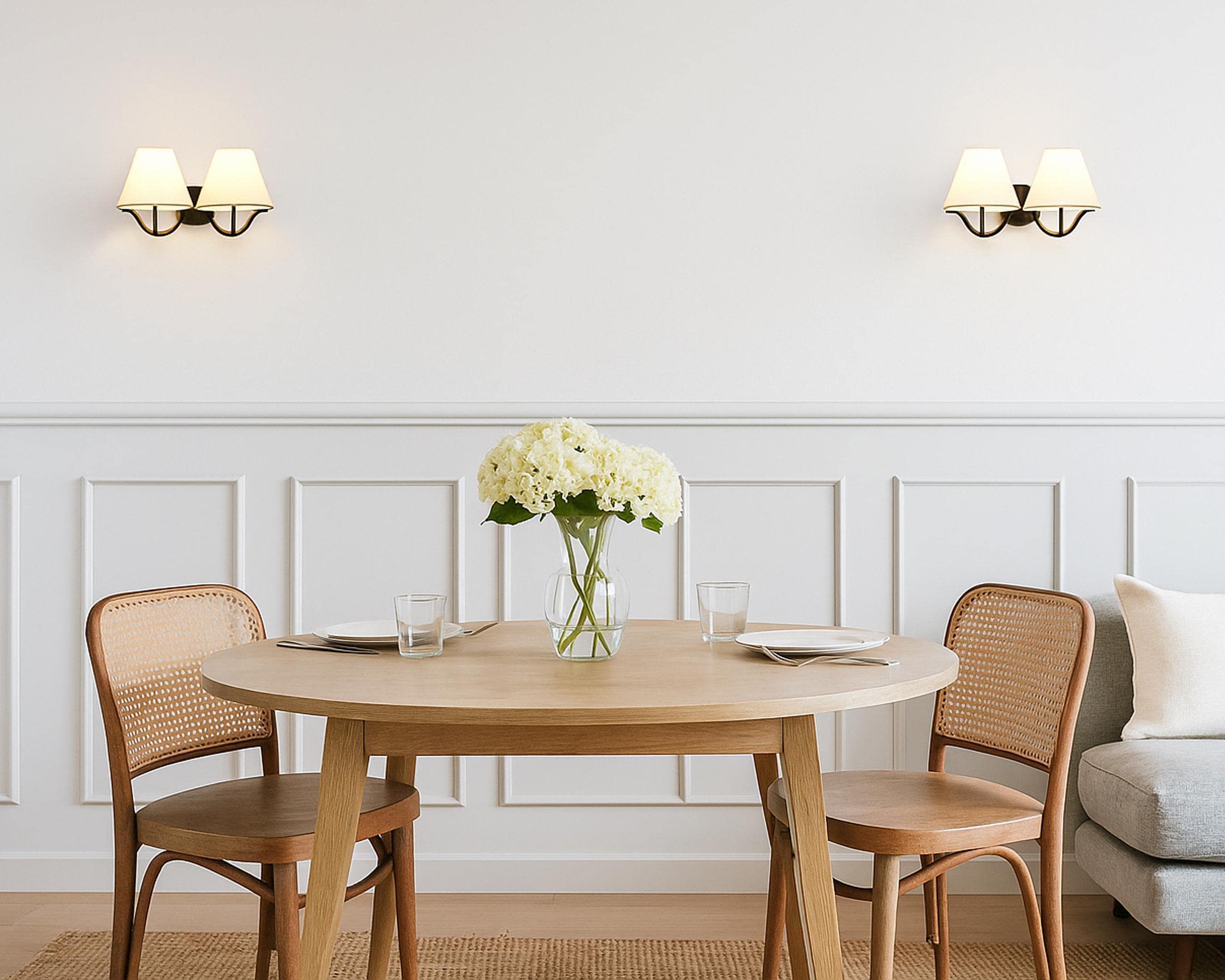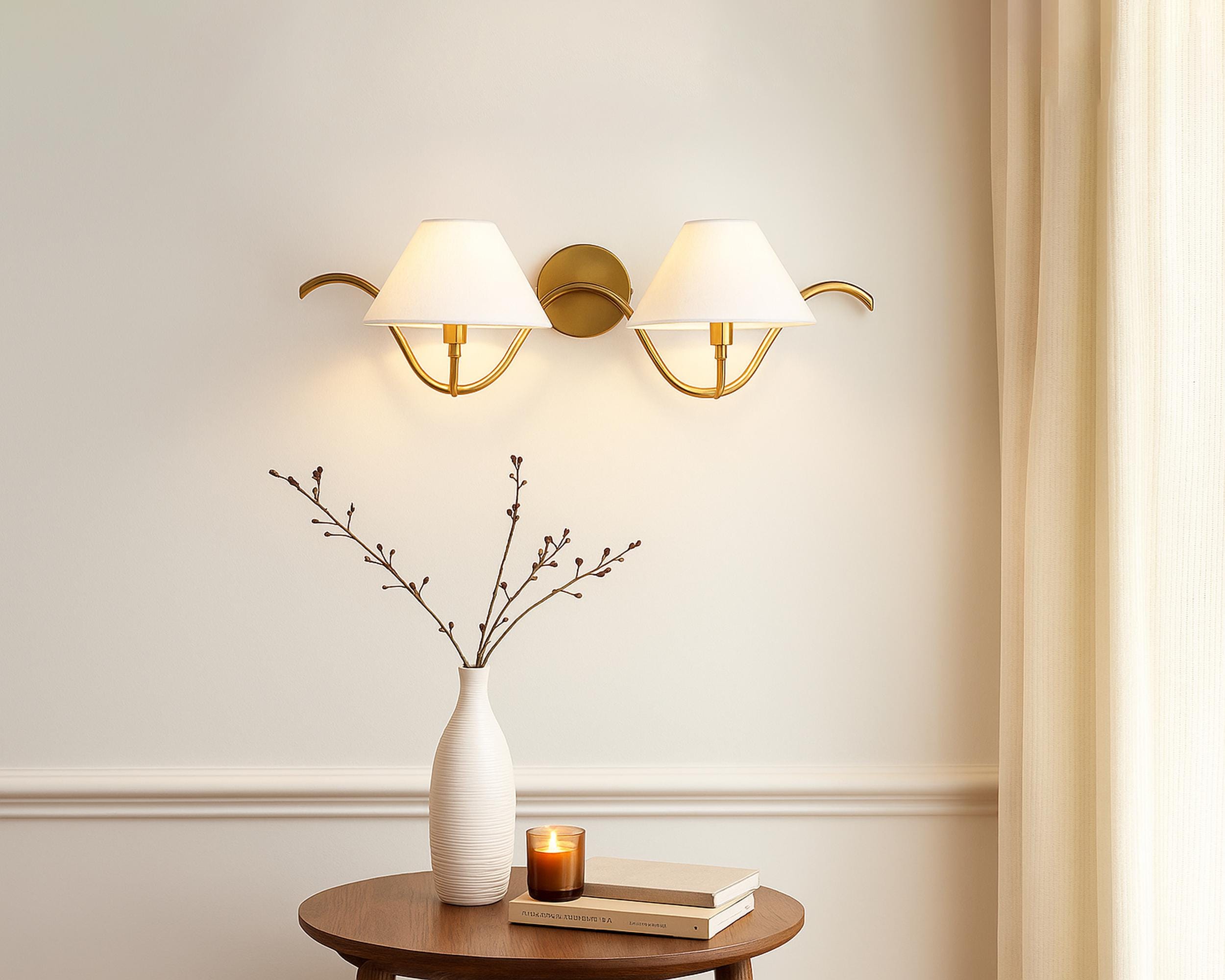 Elegant Double Arm Gold Brass Wall Sconce with Fabric Shades